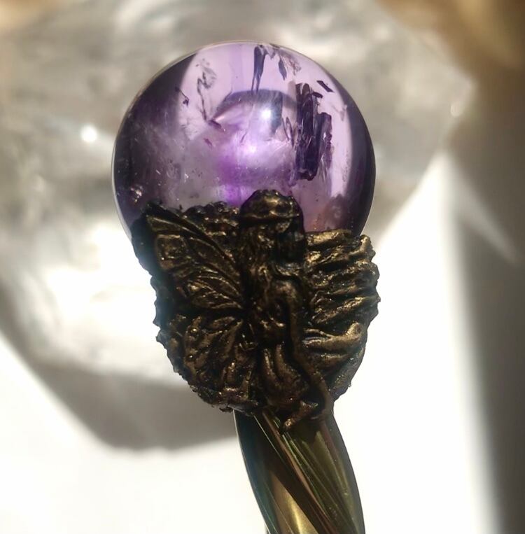 第六チャクラに働きかけて、インスピレーションをおろすアメジストのスフィアのワンドは、タロットリーディングや瞑想のお供にもとてもおすすめです。