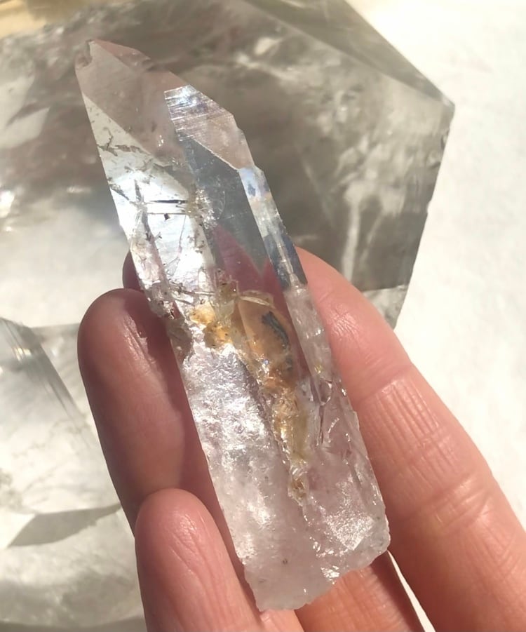 グラウディング力を感じさせる土っぽいヘマタイトやクローライトの内包物を抱えながらも、コロンビア産レムリアンシード原石の特徴である高い透明感があり、全体として光を強く放ち、虹や透明感のあるクリアな輝きを放っています。