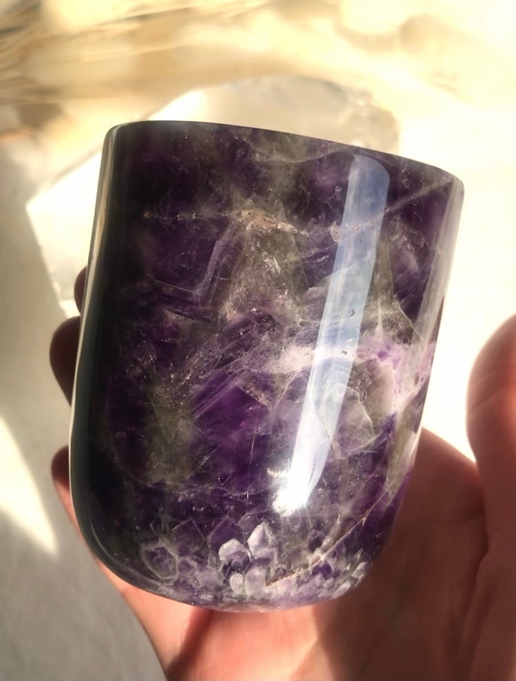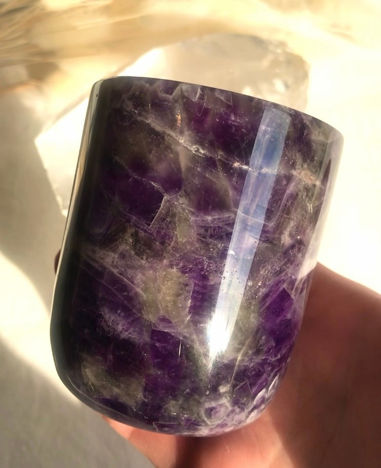 シェブロンアメジストのようなアメジスト結晶がアートのような自然のデザインを創り出した美しいアメジストのグラス。