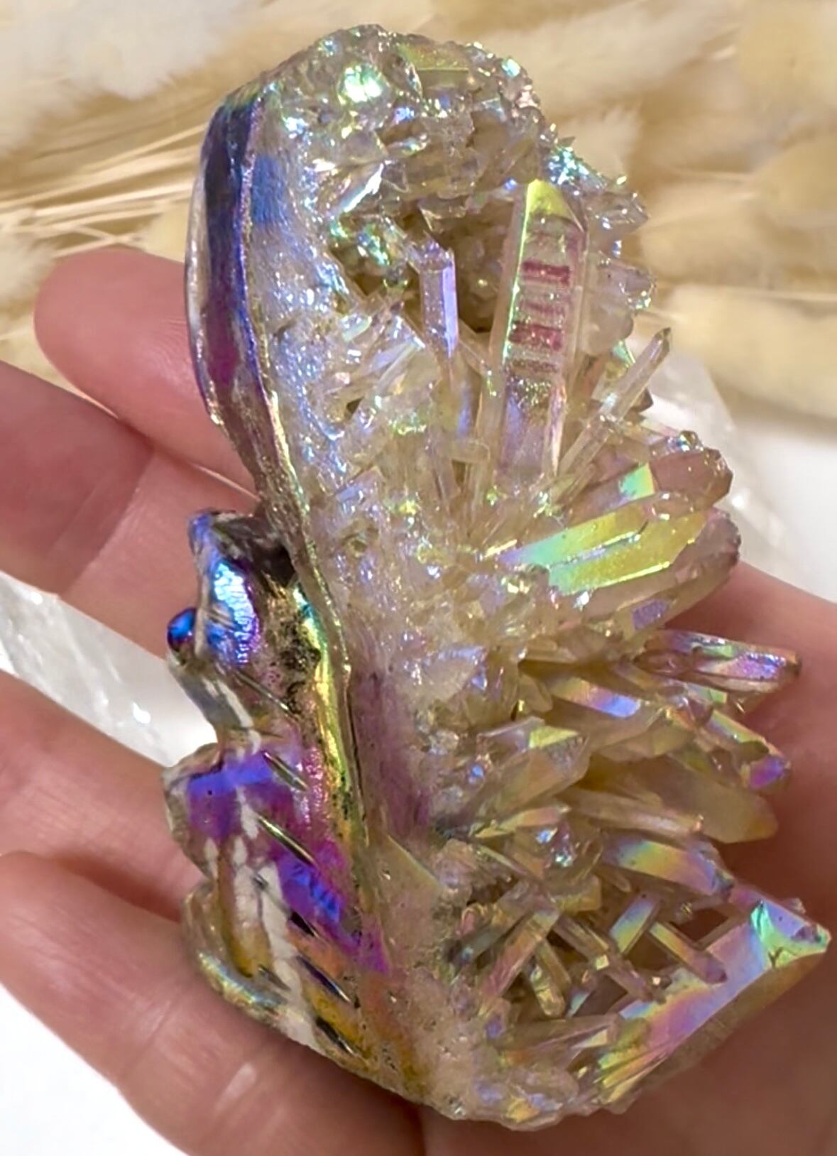 浄化のパワーがとってもパワフルなクラスター水晶をエンジェルオーラ加工することで、水晶の本来のパワーが拡張されると言われています。