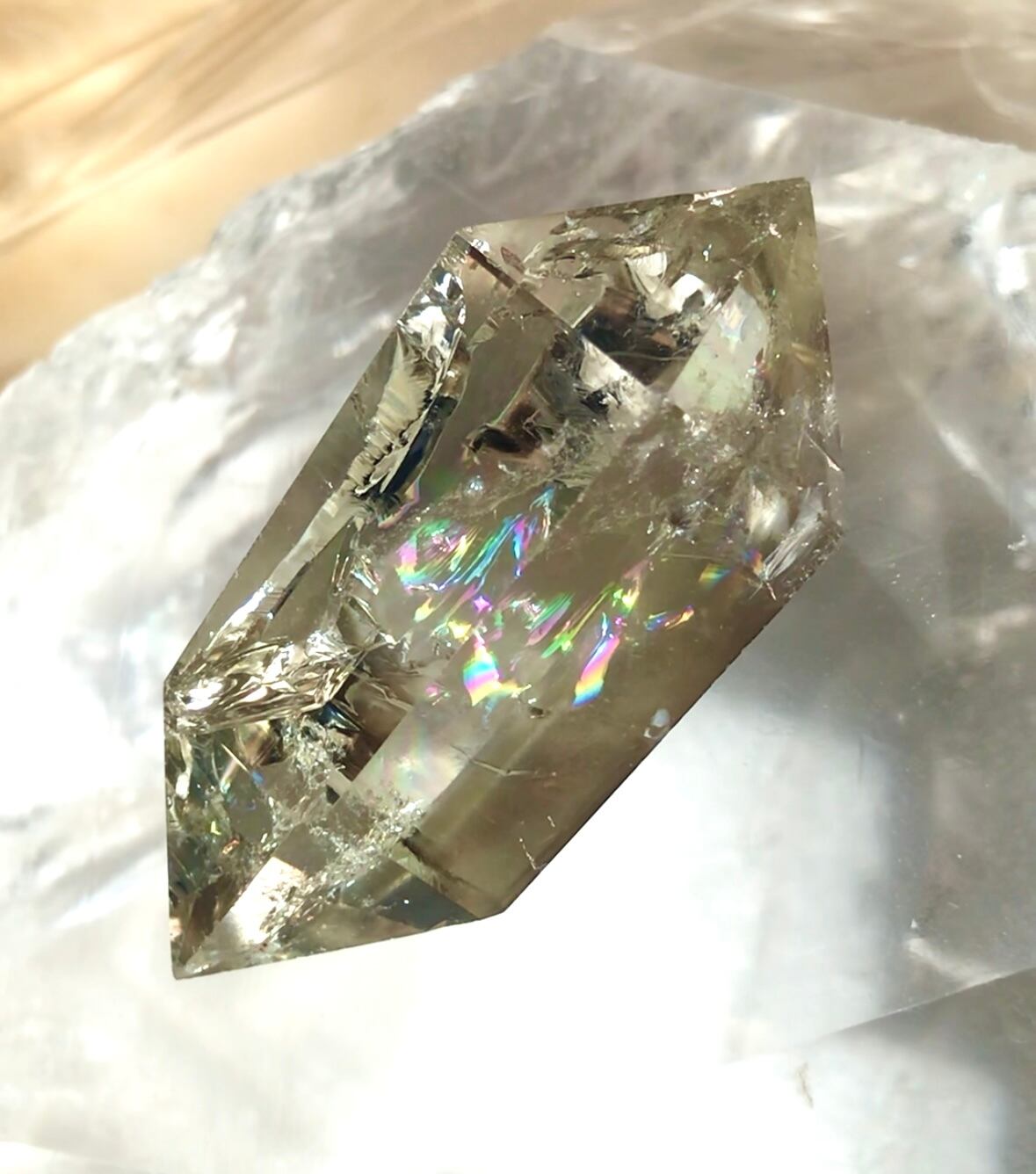 綺麗に虹が入ったダブルターミネティッドの形のシトリン。