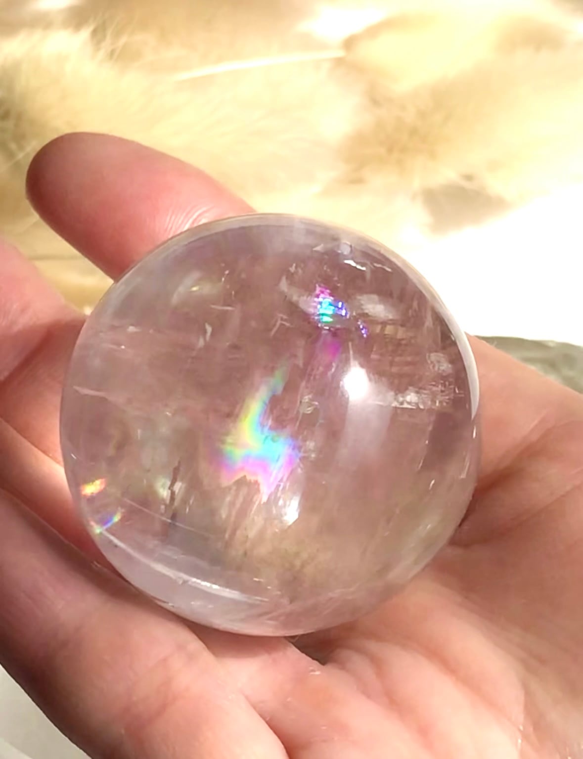 クリアクォーツとはまた違った優しいミルキーカラーに七色のレインボーカラーが浮かびます。
